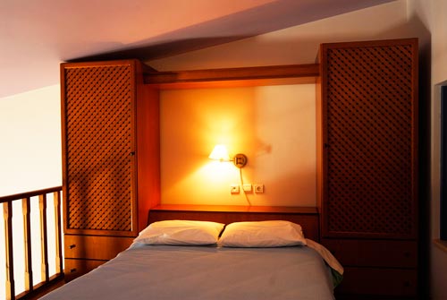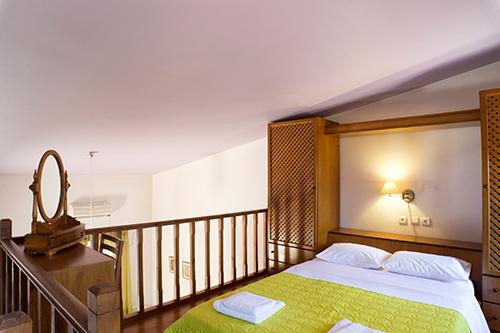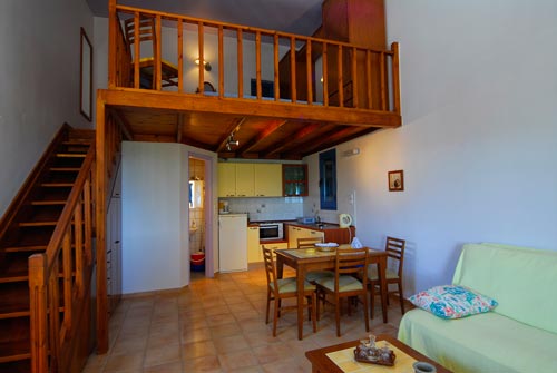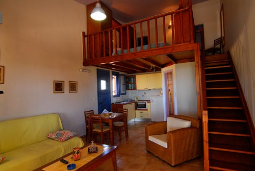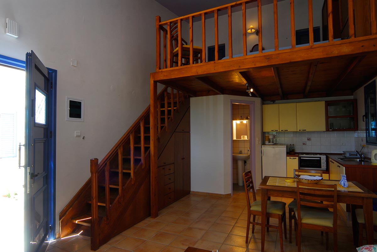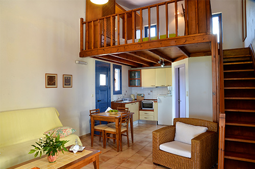 The Olive Garden Studios, slightly smaller than the houses are ideal for a couple but can accommodate up to 4 persons. Built on 2 levels, they dispose of a kitchenette, a living room furnished with a double sofa bed and a bathroom at ground floor, while the main bedroom is on the mezzanine, decorated in a cosy and warm style.